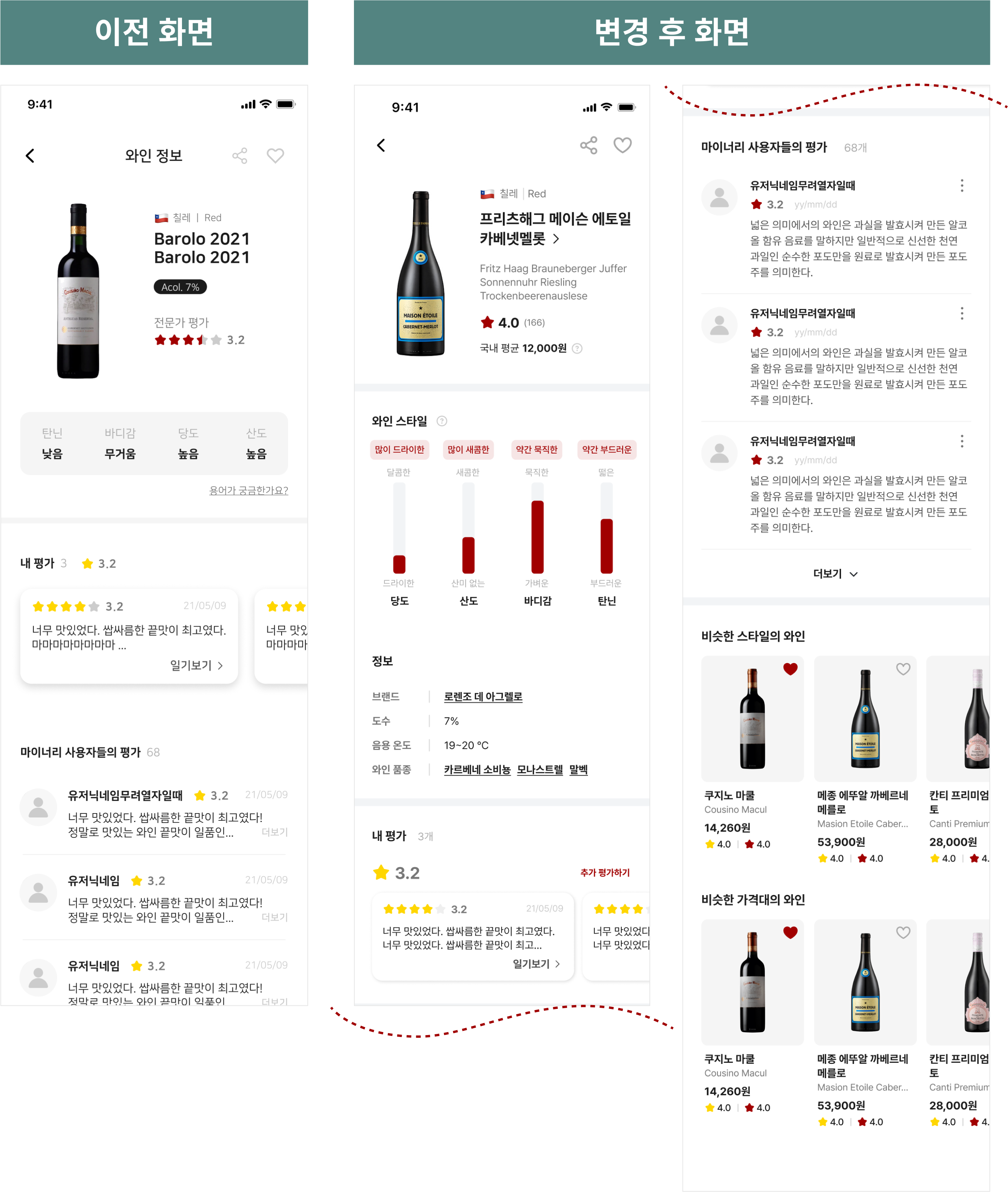 비슷한 스타일, 가격대의 와인을 노출시켜 맞춤 정보를 제공해요.[ 별점 규칙 신규 정의 ]
