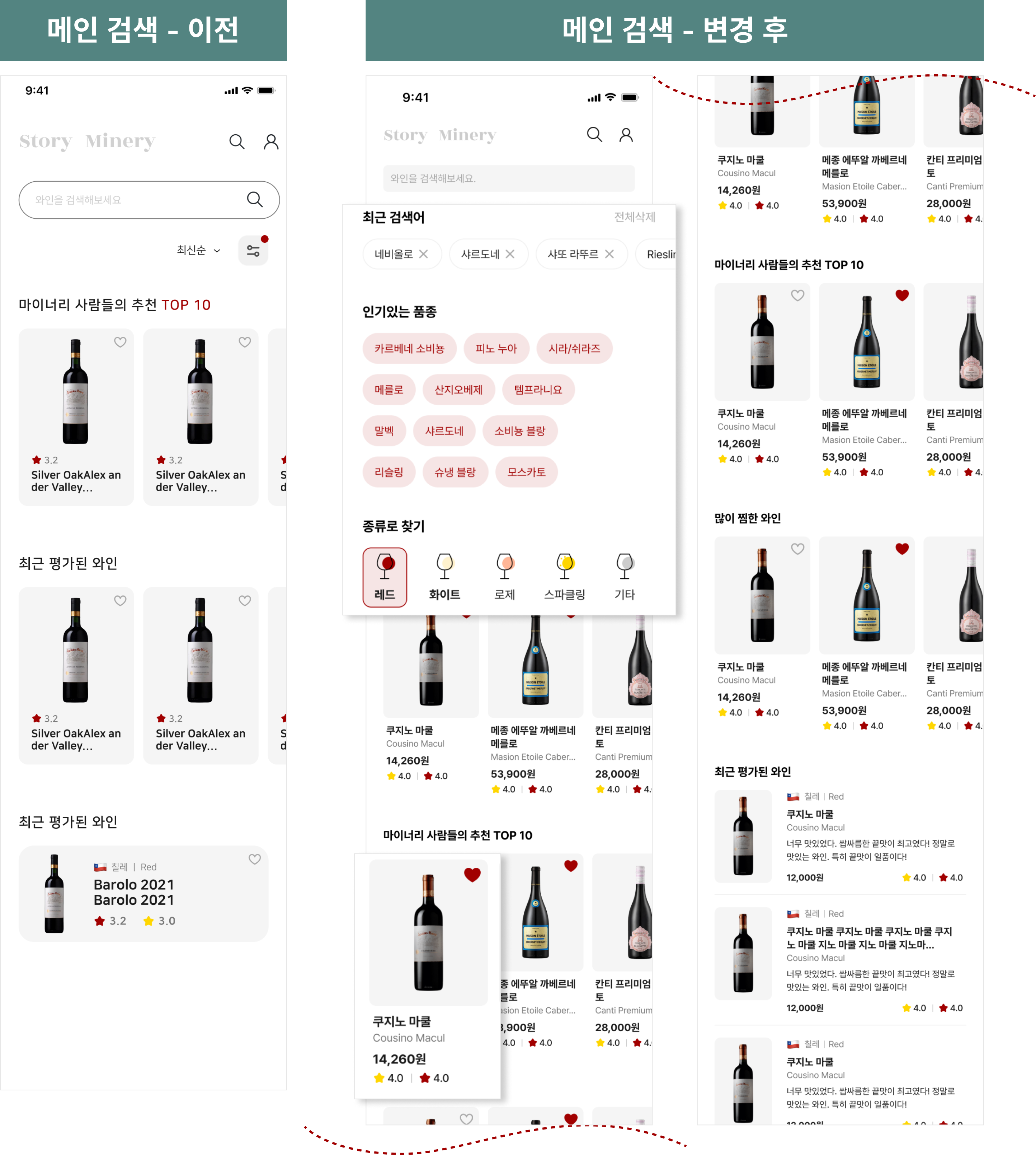01. 다시 입력하기 귀찮은 와인명, 최근 검색어를 가장 상단에 배치해두었어요.02. 종류로 찾기, 인기있는 품종 등 빠른 필터링을 배치해 특별한 문구 검색 없이도 와인을 탐색할 수 있어요.